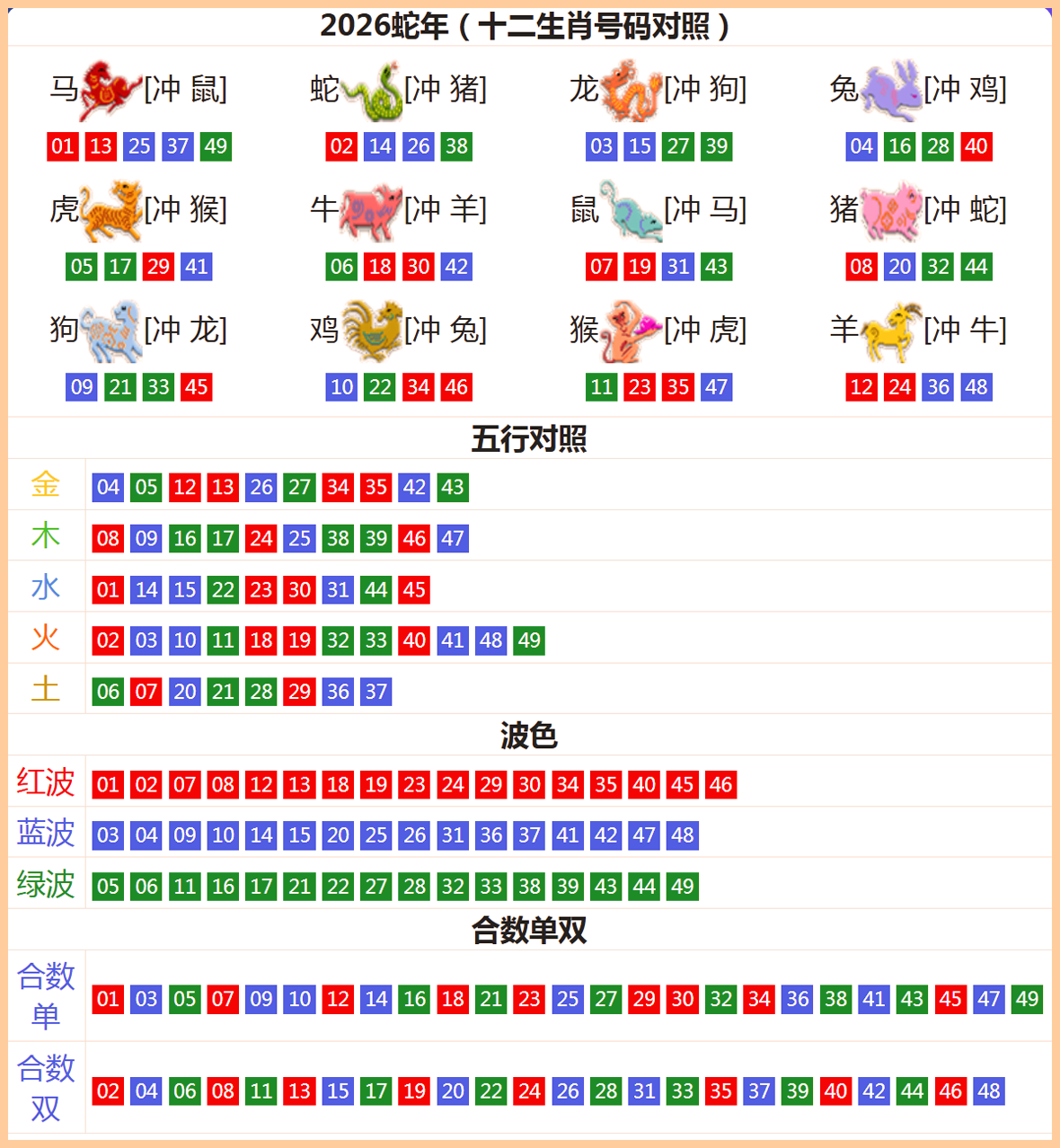 | 五福肖:鼠、虎、兔、蛇、猴[龙] |